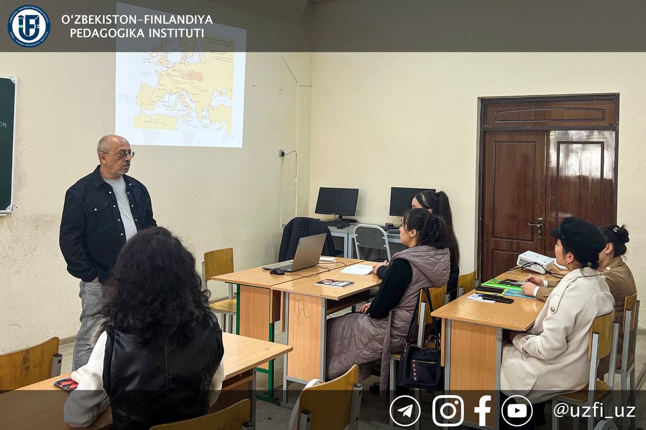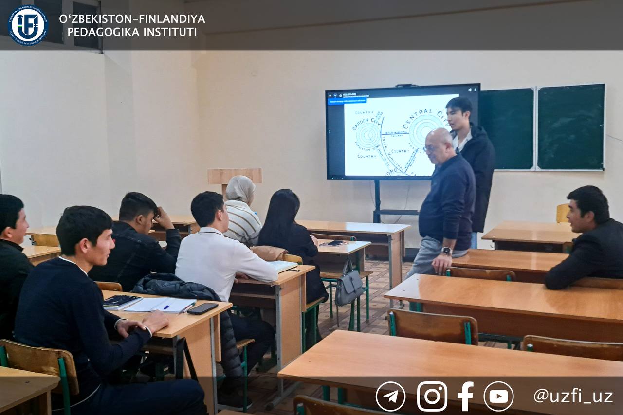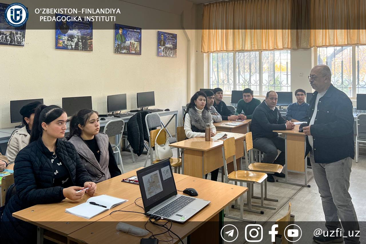 O'zbekiston-Finlandiya pedagogika instituti geografiya va iqtisodiy bilim asoslari ta'lim yo'nalishi talabalariga geografiya kafedrasining turkiyalik professori Kirami Ulgen dars bermoqda.