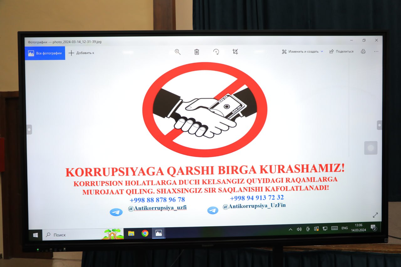 Joriy yilning 14-mart  kuni O'zbekiston-Finlandiya pedagogika instituti talabalari ishtirokida Korrupsiyaga qarshi kurashish "Komplayens- nazorat" tizimini boshqarish bo'limi va Samarqand shahar IIO FMB 5-sonli IIB bilan hamkorlikda "Korrupsiyaga qarshi birga kurashamiz!" mavzusida davra suhbati o'tkazildi.