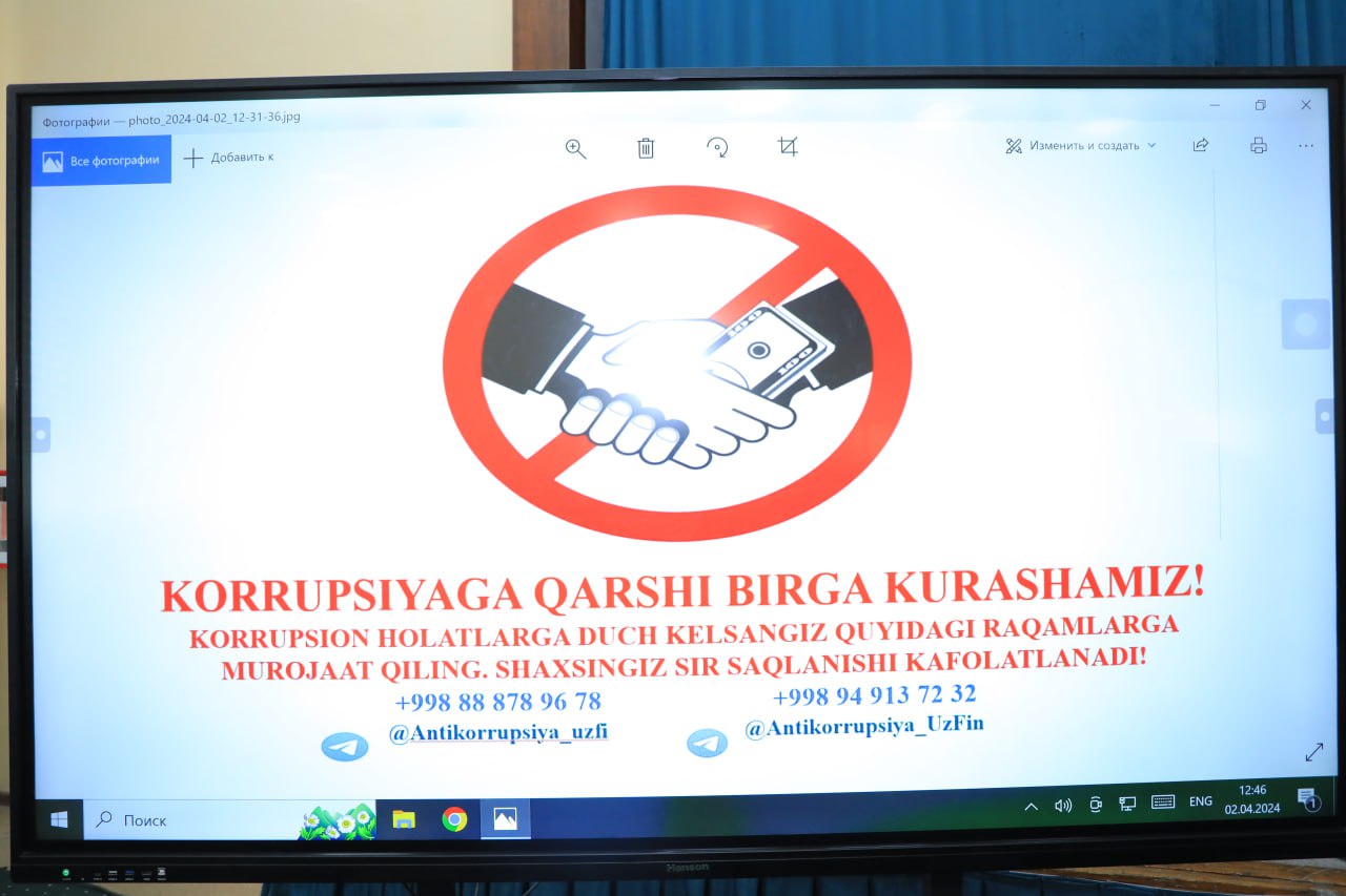 Tadbirda talabalarga korrupsiyaga qarshi kurashish borasida olib borilayotgan amaliy ishlar to'g'risida ma'lumot berildi. Xususan, unga qarshi kurashishga hamma birdek ma'sul ekanligi ta'kidlandi. Fakultetlarda tashkil qilingan "Adolat qutisi"dan, korrupsion holatlar haqida xabar berish mumkin bo'lgan ishonch talefonlari va telegram botlaridan foydalanish lozimligi qayd etildi.