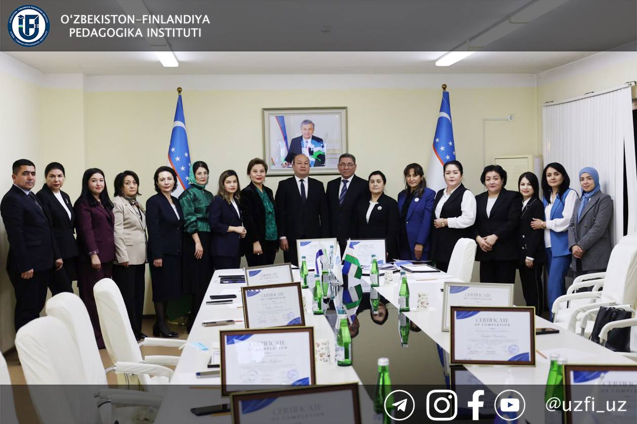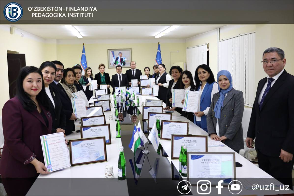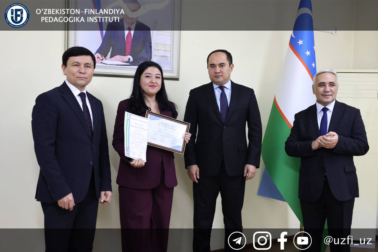 Finlandiya hamda Bosh ilmiy metodik markaz bilan hamkorlikda tashkil etilgan malaka oshirish dasturi kursini muvaffaqiyatli tamomlaganligi uchun O'zbekiston-Finlandiya pedagogika instituti maktabgacha va boshlang'ich ta'lim fakulteti dekani Yulduz Ne’matjonova malaka attestati va sertifikat bilan taqdirlandi.