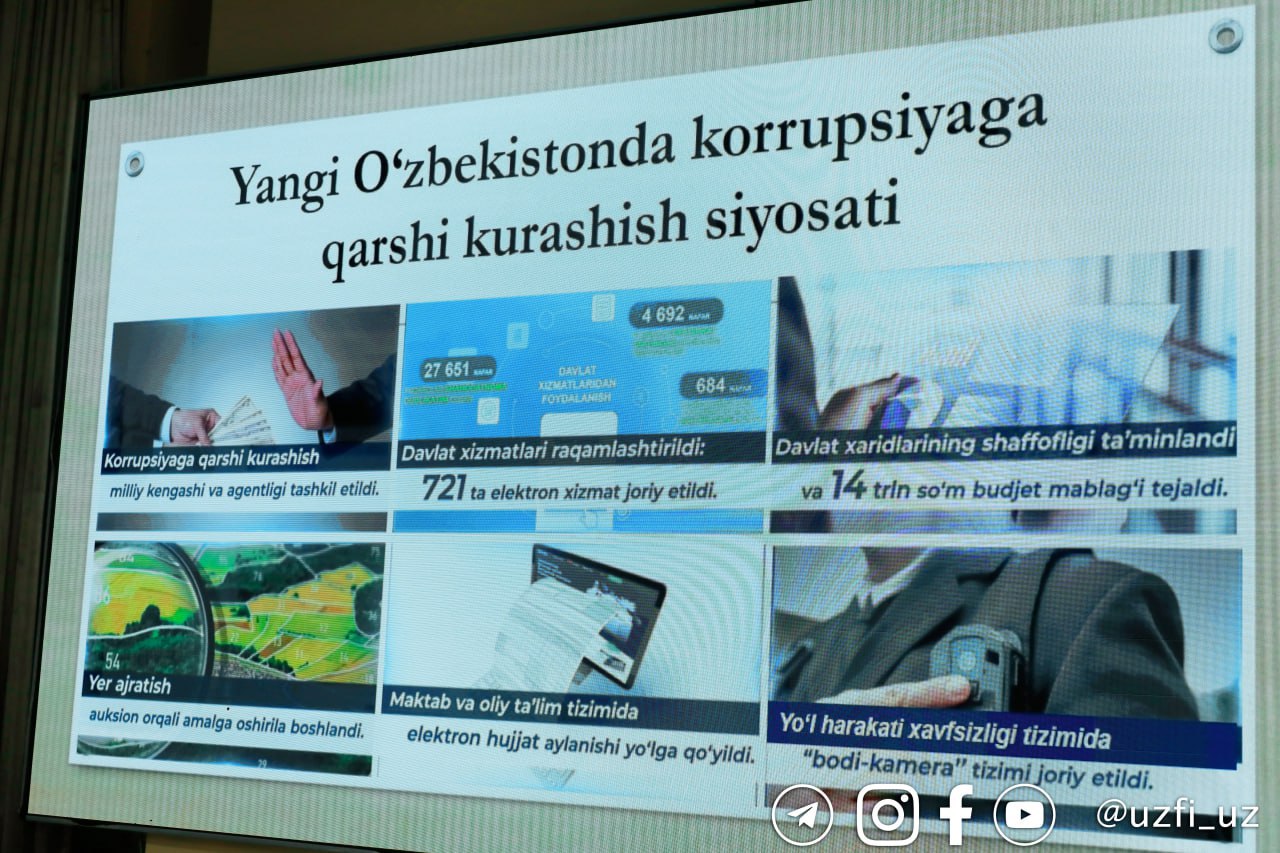 Tadbirda korrupsiyaning mazmun-mohiyati, uning jamiyat taraqqiyotiga salbiy ta’siri va ijtimoiy hayotda yuzaga keltiradigan oqibatlari xususida atroflicha ma’lumotlar berildi. Mutaxassislar tomonidan korrupsiyaga qarshi kurashishning huquqiy va axloqiy asoslari, bu illatga qarshi fuqarolik pozitsiyasini mustahkamlash zarurligi ta’kidlandi.