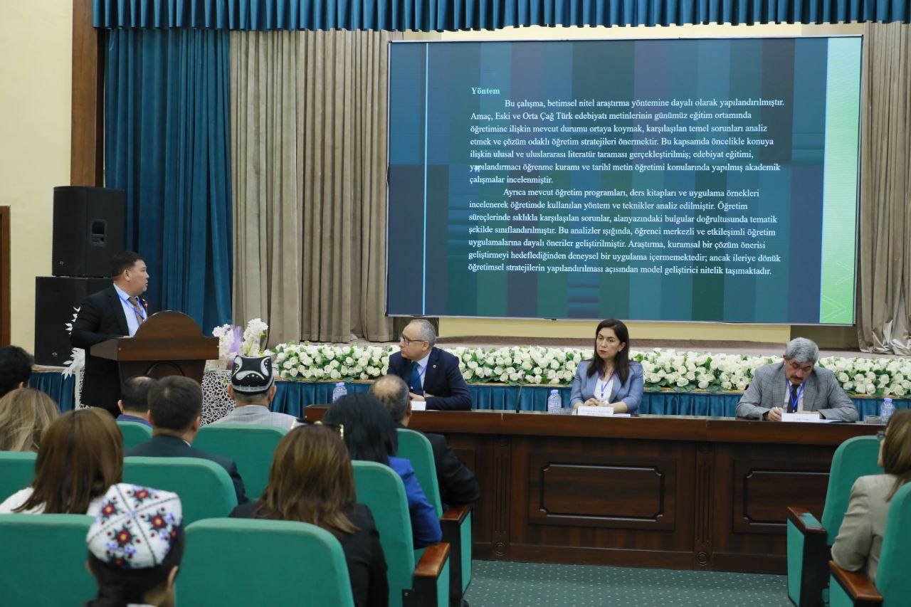 Ahmad Yassaviy nomidagi Xalqaro Qozoq-Turk universiteti dotsenti, filologiya fanlari doktori Yerlan Alashbayev “Qadimgi va o‘rta davr turk adabiyotini o‘qitishning samarali usullari” mavzusida ma’ruza qildi. U adabiy yodgorliklarni zamonaviy ta’limga tatbiq etish va innovatsion yondashuvlar haqida fikr bildirdi.
