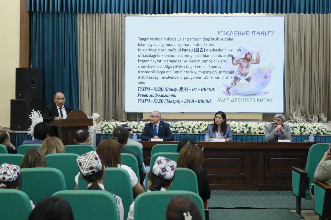 Samarqand davlat chet tillar instituti dotsenti, filologiya fanlari doktori Erkin Musurmanov “Turkiy va xitoy xalqlari mifologiyalari genezisida uyg‘unlik va o‘ziga xoslik” mavzusida ma’ruza qildi. U qadimiy mifologik tasavvurlar, ularning mushtarak jihatlari hamda madaniy tafovutlar asosida shakllangan o‘ziga xosliklarni tahlil qildi.