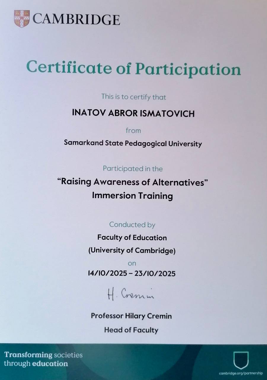 O‘zbekiston Respublikasi Prezidentining 2025-yil 28-apreldagi PF–73-sonli Farmoni doirasida pedagogika oliy ta’lim muassasalari professor-o‘qituvchilari Cambridge University Press & Assessment bilan hamkorlikda tashkil etilgan malaka oshirish dasturini muvaffaqiyatli yakunladilar.