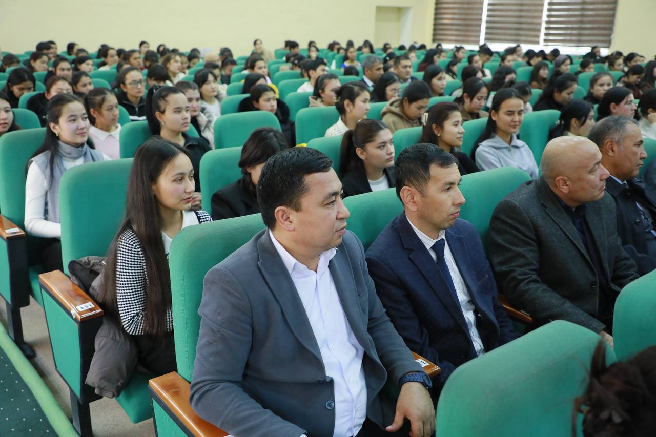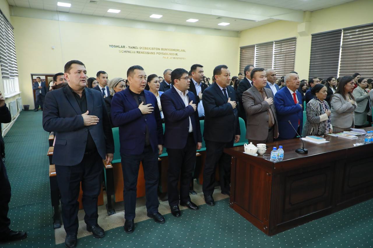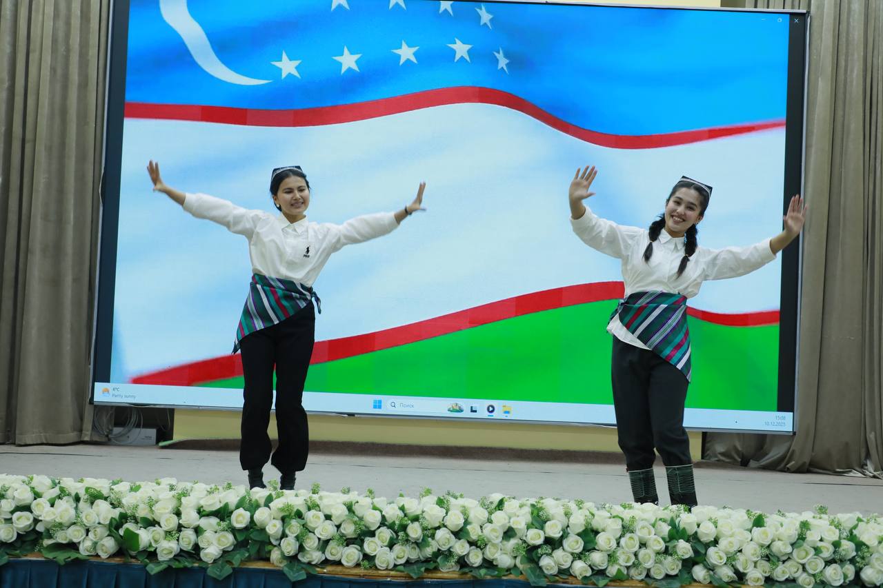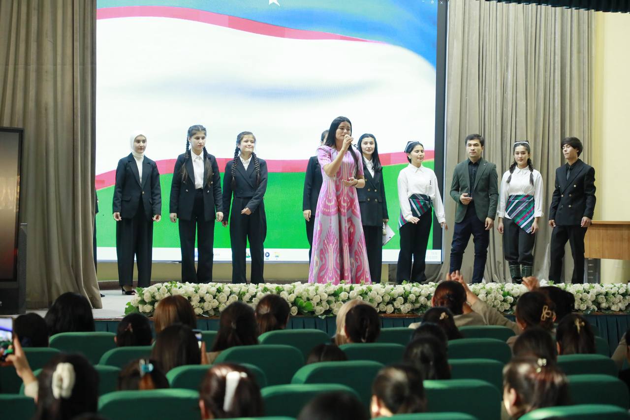 Rektor Shahzoda Negmatova tadbirni ochib berar ekan, Konstitutsiyaning davlatimiz taraqqiyotidagi beqiyos o‘rni, xalqimizning erkin va farovon hayotini ta’minlashdagi asosiy huquqiy poydevor ekanligi, shuningdek, madhiyamizning millat g‘ururi va sha’nini ifodalovchi muqaddas qo‘shiq sifatidagi ahamiyatini alohida ta’kidladi.