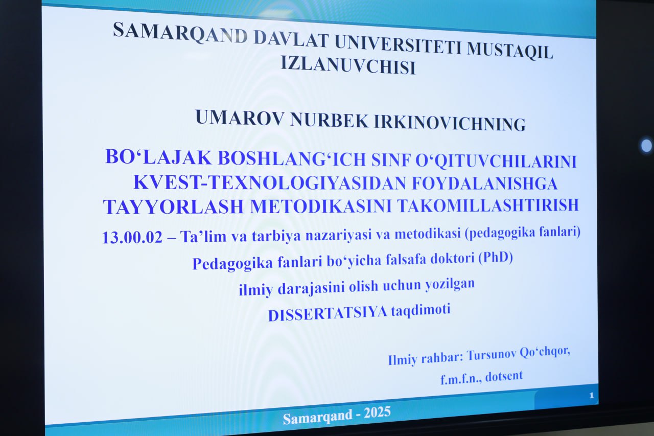 Yig‘ilishda 13.00.02 – Ta’lim va tarbiya nazariyasi va metodikasi ixtisosligi bo‘yicha tadqiqotchi Umarov Nurbek Irkinovichning pedagogika fanlari bo‘yicha falsafa doktori (PhD) ilmiy darajasini olish uchun tayyorlagan “Bo‘lajak boshlang‘ich sinf o‘qituvchilarini kvest texnologiyasidan foydalanishga tayyorlash metodikasini takomillashtirish” mavzusidagi dissertatsiya ishi muhokama qilindi.
