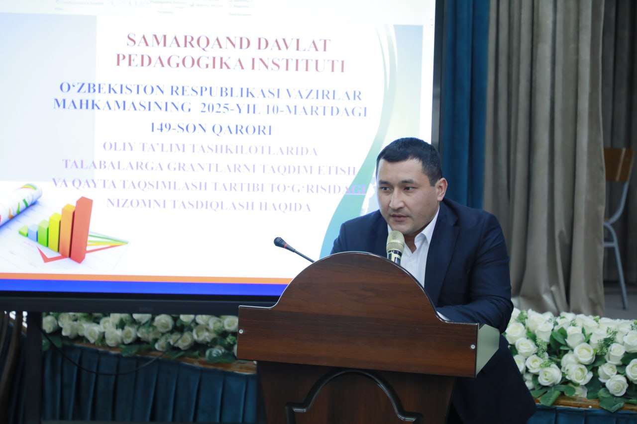 Samarqand davlat pedagogika instituti magistrantlari ishtirokida O‘zbekiston Respublikasi Vazirlar Mahkamasining 2025-yil 10-martdagi 149-sonli qarori hamda “Oliy ta’lim tashkilotlarida talabalarga grantlarni taqdim etish va qayta taqsimlash tartibi to‘g‘risidagi nizom”ning mazmun-mohiyatini tushuntirishga bag‘ishlangan uchrashuv bo‘lib o‘tdi.