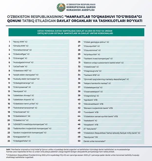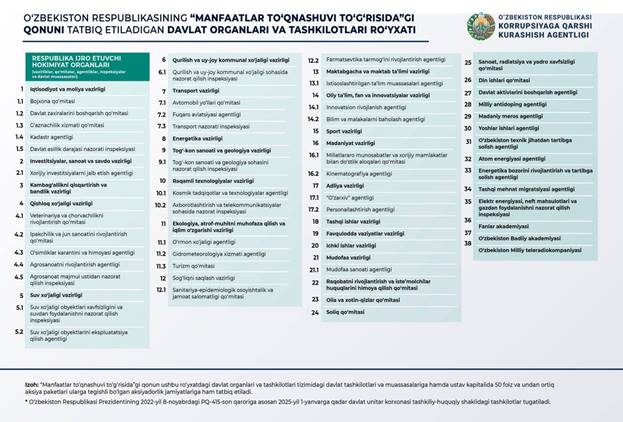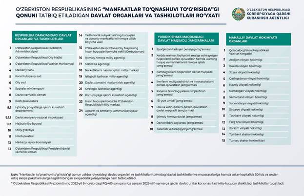 Davlat rahbarining PQ-210-son qarori (https://lex.uz/en/docs/-6954264?otherlang=) ijrosini ta’minlash maqsadida “Manfaatlar to‘qnashuvi to‘g‘risida”gi qonun ijrosini tashkil etish ishlarini muvofiqlashtirish bo‘yicha Respublika idoralararo komissiyasi tomonidan qonun tatbiq etiladigan davlat organlari va tashkilotlarining aniq ro‘yxati tasdiqlandi (https://t.me/antikor_uzb/3105).